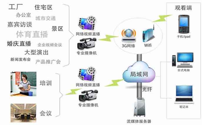 手機(jī)視頻直播系統(tǒng)是無(wú)線網(wǎng)絡(luò)技術(shù)應(yīng)用多的領(lǐng)域之一。手機(jī)視頻直播系統(tǒng)主要用于對(duì)重要區(qū)域或遠(yuǎn)程地點(diǎn)的監(jiān)督和控制(如工廠、辦公室、住宅區(qū)、景區(qū)、城市交通、體育直播、婚慶直播、企業(yè)視頻會(huì)議、新聞發(fā)布會(huì)、產(chǎn)品推廣會(huì)、大型演出、嘉賓訪談等),視頻直播系統(tǒng)將被監(jiān)控點(diǎn)實(shí)時(shí)采集的視頻文件及時(shí)地傳輸給監(jiān)控中央,實(shí)時(shí)動(dòng)態(tài)地講演被監(jiān)測(cè)點(diǎn)的情況,及時(shí)發(fā)現(xiàn)問題并進(jìn)行處理。